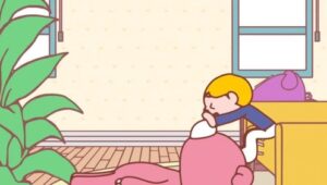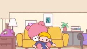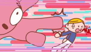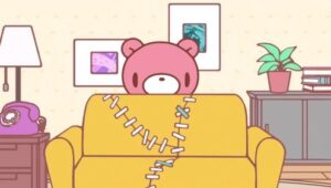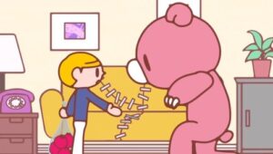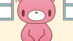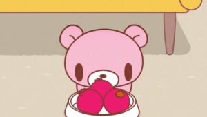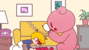Gloomy, an abandoned little bear, is rescued by Pitty (the little boy). At first, he is cute and cuddly, but becomes wilder as he grows up. Since bears do not become attached to people like dogs by nature, Gloomy attacks Pitty even though he is the owner. So Gloomy has blood on him from biting and/or scratching Pitty.